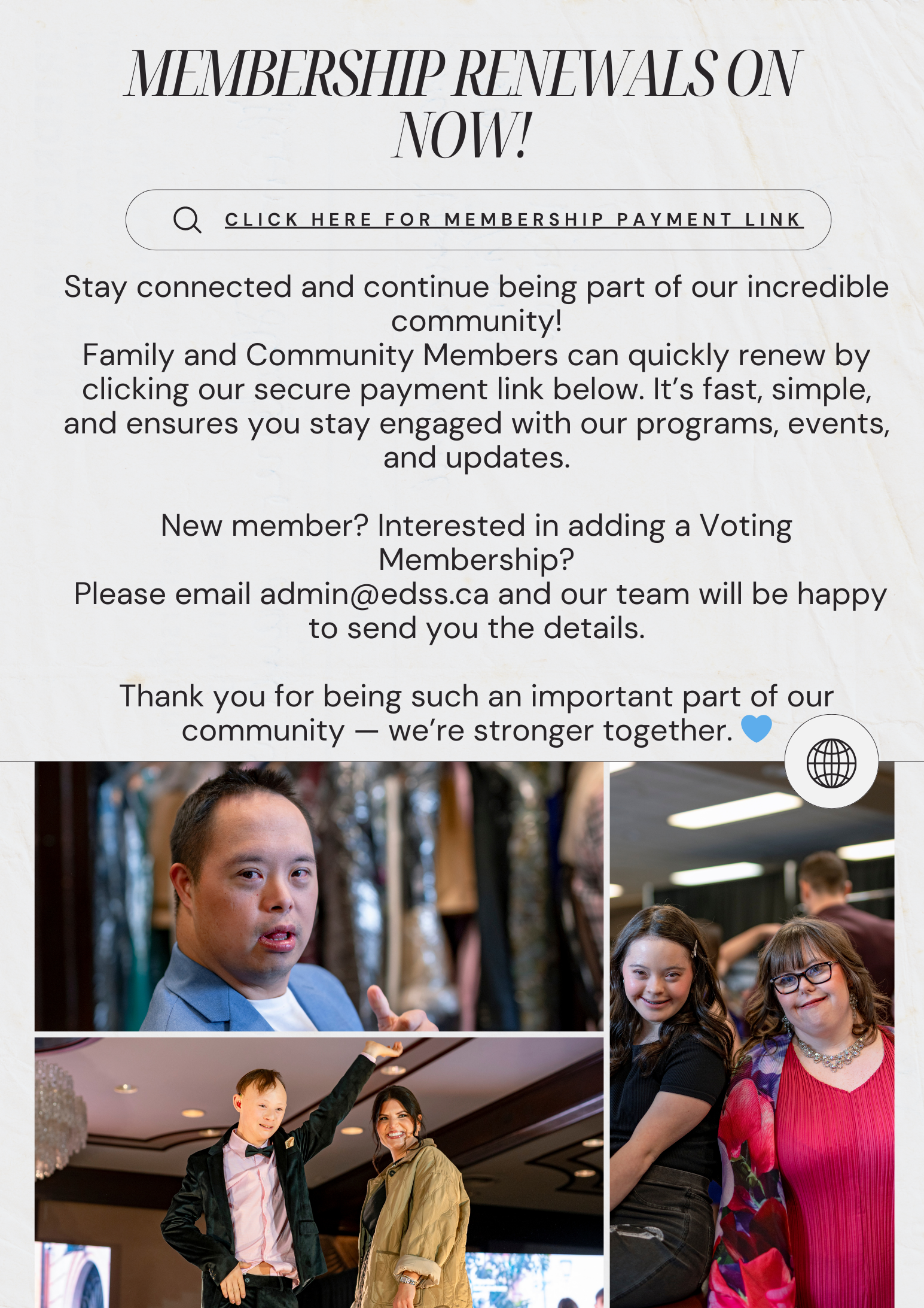 Your family can still participate at EDSS without purchasing a voting membership add-on. Non-voting memberships of EDSS are offered to all families with a person born with Down syndrome who are participating in EDSS programs, attending events, accessing resources, scholarships, and staying connected with news, advocacy initiatives and research in the Ds community. Engaging and recording non-voting membership is also equally important for insurance and communication purposes.